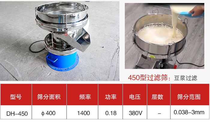 1、450過(guò)濾篩:時(shí)產(chǎn)量300公斤-500公斤/h,篩分粒度0.038-5,外形尺寸360×300×470mm。
