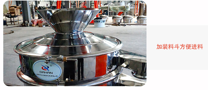 粗砂糖振動篩細(xì)節(jié):料斗,大漢機(jī)械廠家標(biāo)識,防塵蓋,出料口,振動彈簧,大束環(huán)等。