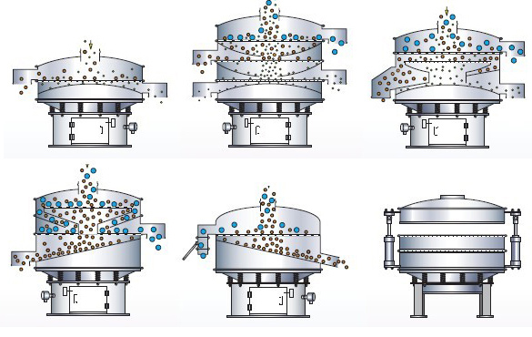 采用立式振動電機作為激振源,通過振動電機上下兩端的偏心重錘將旋轉(zhuǎn)運動轉(zhuǎn)變?yōu)樗?、垂直、傾斜的三次元運動,并傳遞到旋振篩的篩面上;物料通過入料口進入設(shè)備內(nèi),根據(jù)不同物料篩分要求,物料經(jīng)過1-5層采用不同目數(shù)的金屬編織篩網(wǎng)的篩分層,在這個過程中,位于各層的篩網(wǎng)下的清網(wǎng)裝置(硅膠彈跳球)通過頻率振動不斷撞擊篩網(wǎng),使篩網(wǎng)上層物料能夠順暢的透網(wǎng)篩分,并有效解決了物料堵網(wǎng)問題出現(xiàn),不同目數(shù)的物料通過各層對應(yīng)目數(shù)的篩網(wǎng)后在各層的出料口排出,終實現(xiàn)篩選除雜或過濾分級的目的。