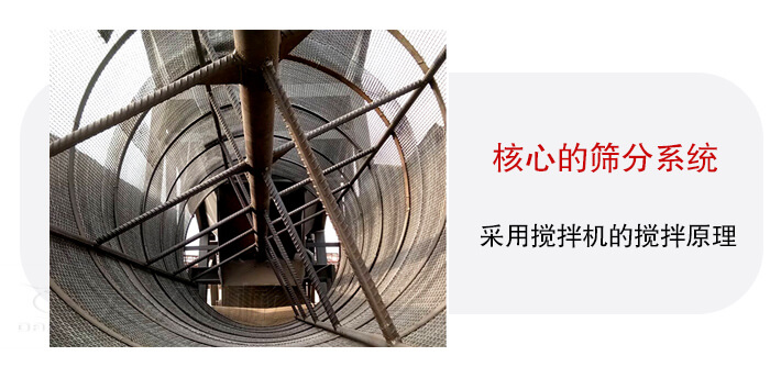 其核心的篩分系統(tǒng)采用攪拌機(jī)的攪拌原理,原料在攪拌筒內(nèi)受連續(xù)螺旋葉片翻滾、推擠及物料間相互磨擦作用,作用強(qiáng)烈可靠性高。