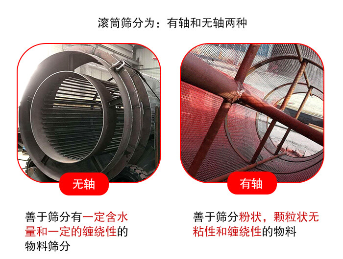 2,根據(jù)所篩分的物料選擇不同結(jié)構(gòu)的產(chǎn)品,對(duì)于滾筒篩大致能夠分為:有軸和無軸兩種,有軸的善于篩分粉狀,顆粒狀無粘性和纏繞性的物料。無軸的則是和一些有一定含水量和一定的纏繞性的物料篩分。
