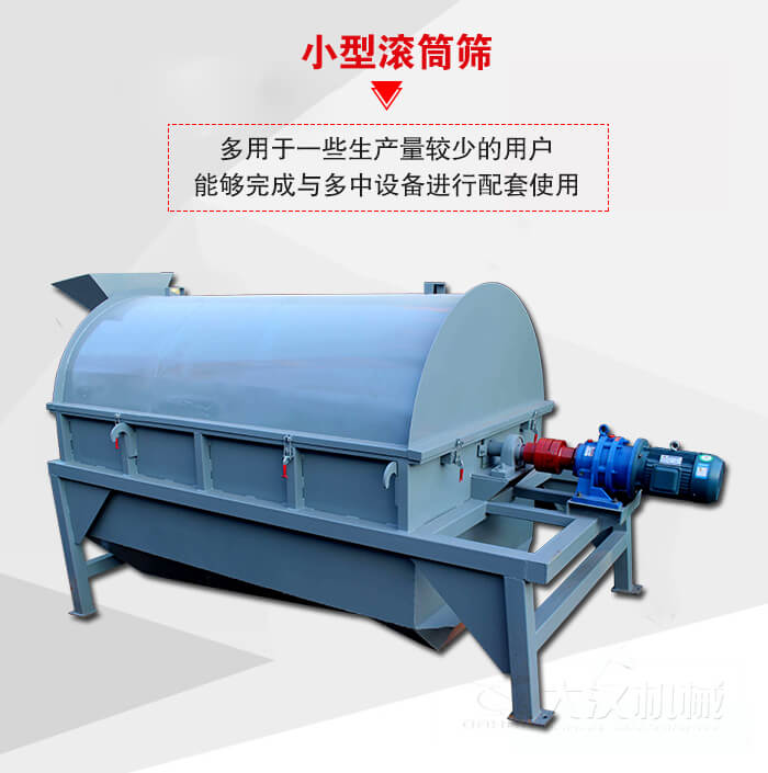小型滾筒篩多用于一些生產(chǎn)量較少的用戶,與大型滾筒篩相比該產(chǎn)品的篩分直徑小,篩網(wǎng)面積小,驅(qū)動(dòng)功率小,所以稱之為小型滾筒篩,但其改裝比較容易能夠完成與多中設(shè)備進(jìn)行配套使用。