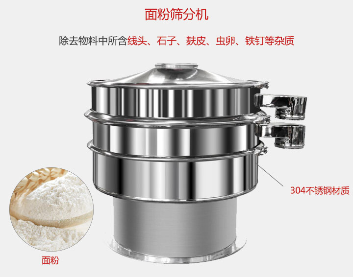 產(chǎn)品簡(jiǎn)介:面粉:面粉是面包,蛋糕以及饅頭的主要原材料,由于存放時(shí)間及環(huán)境問(wèn)題面粉可能會(huì)出現(xiàn)結(jié)塊的現(xiàn)象,所以要借助面粉振動(dòng)篩將其分離處理。一般要求使用20-30目的篩網(wǎng)對(duì)面粉進(jìn)行篩分。 面粉篩分機(jī)概述 面粉篩分機(jī)采用篩框,篩網(wǎng),出料口等與物料接觸的部分均采用304不銹鋼材質(zhì),常用12目、20目、24目、30目、40目、60目。使用分機(jī)主要除去物料中所含線頭、石子、麩皮、蟲卵