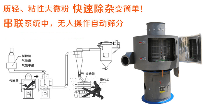 3、產(chǎn)量大:可與各種磨機,風(fēng)路并網(wǎng)配套使用,臺時產(chǎn)量是振動篩的5-10倍或更高。