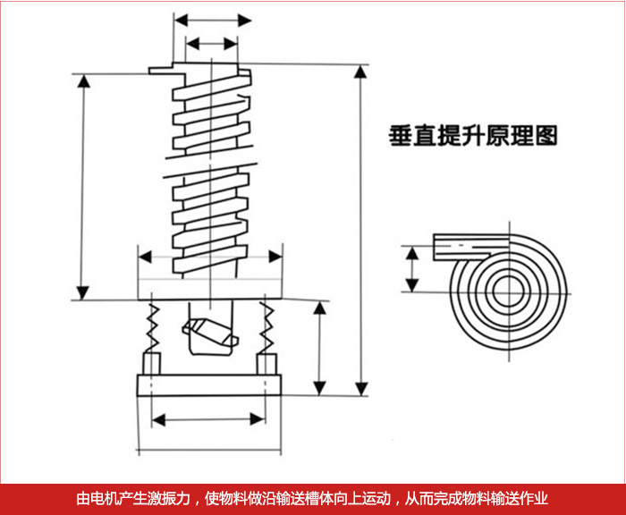 螺旋垂直振動(dòng)提升機(jī)DZC系列垂直振動(dòng)輸送機(jī)的驅(qū)動(dòng)裝置振動(dòng)電機(jī)安裝在輸送塔下部,兩臺(tái)振動(dòng)電機(jī)對(duì)稱交叉安裝,輸送塔由管體和焊接在管體周?chē)穆菪斔筒劢M成,輸送塔座于減振裝置上,減振裝置由底座和隔振彈簧組成。當(dāng)垂直輸送機(jī)工作時(shí),根據(jù)雙振動(dòng)電機(jī)自同步原理,由振動(dòng)電機(jī)產(chǎn)生激振力,強(qiáng)迫整個(gè)輸送塔體作水平圓運(yùn)動(dòng)和向上垂直運(yùn)動(dòng)的空間復(fù)合振動(dòng),螺旋槽內(nèi)的物料則受輸送槽的作用,作勻速拋擲圓運(yùn)動(dòng),沿輸送槽體向上運(yùn)動(dòng),從而完成物料的向上(或向下)輸送作業(yè)。
