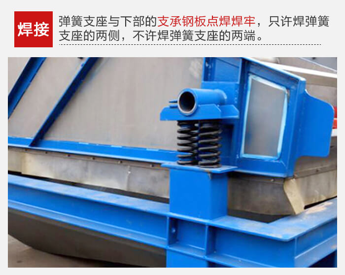 振動器各部分安裝完畢,調(diào)整好相對位置,各處的一次、二次隔振動彈簧均呈垂直狀態(tài)后,把彈簧支座與下部的支承鋼板點(diǎn)焊焊牢。焊接時(shí),只許焊彈簧支座的兩側(cè),不許焊彈簧支座的兩端。