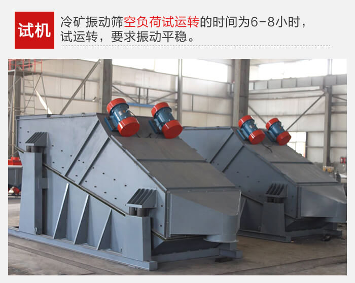 冷礦振動篩空負(fù)荷試運(yùn)轉(zhuǎn)的時(shí)間為6-8小時(shí),試運(yùn)轉(zhuǎn),要求振動平穩(wěn),無橫向擺動及不正常響聲。如發(fā)現(xiàn)上述問題,應(yīng)及時(shí)檢查原因,排除故障。