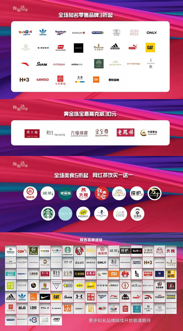 除了各種活動外,海駿達(dá)城在開放當(dāng)天還聯(lián)合各大品牌商家實(shí)行多重優(yōu)惠重磅輸出,鉅惠全城。轉(zhuǎn)發(fā)有禮,會員專享積分,零售品牌全場最低3折,餐飲品牌全場最低5折,黃金最高克減30元等。其中,玩具反斗城滿200送100、滿100減50;VERO MODA全場5折起;Adidas originals全場8折;金至尊彩金鉆石滿1000立減300;海底撈送送菜卡;椒戲酸菜魚5折……吃喝玩樂購,應(yīng)有盡有,一應(yīng)俱全,瞬間滿足。
